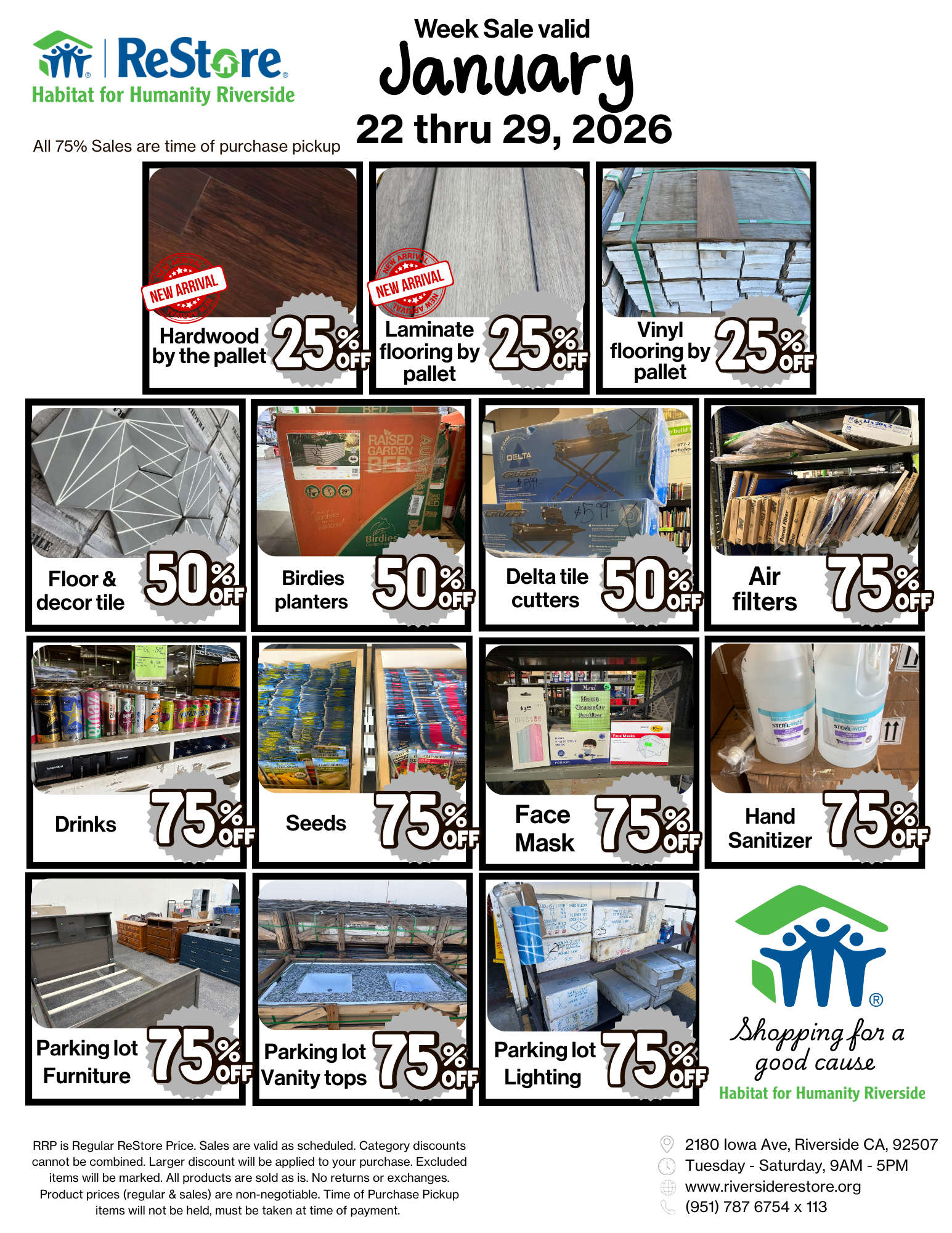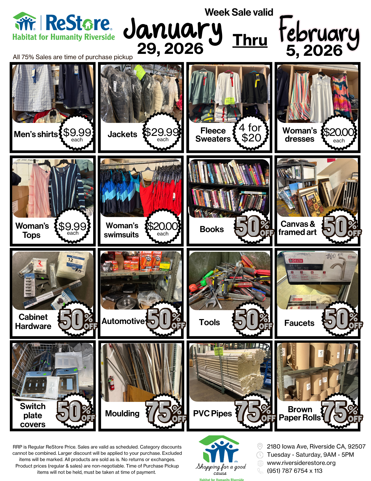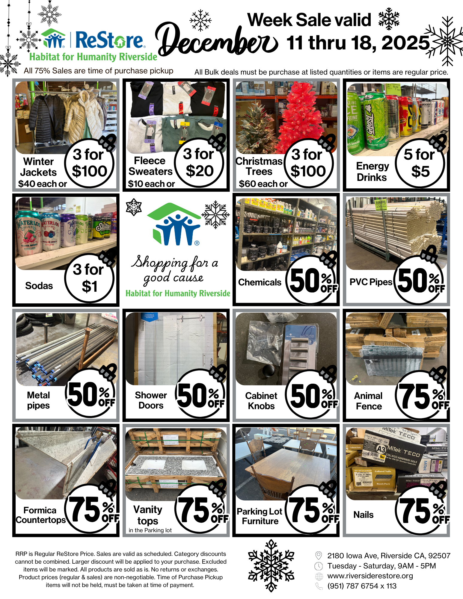 RRP is Regular ReStore Price, Sales are valid as scheduled. Category discounts cannot be combined on Thursday Double Day Sales, larger discount will be applied to your purchase. Excluded items will be marked. All products are sold as is, no returns or exchanges. Product prices (regular & sales) are non-negotiable.